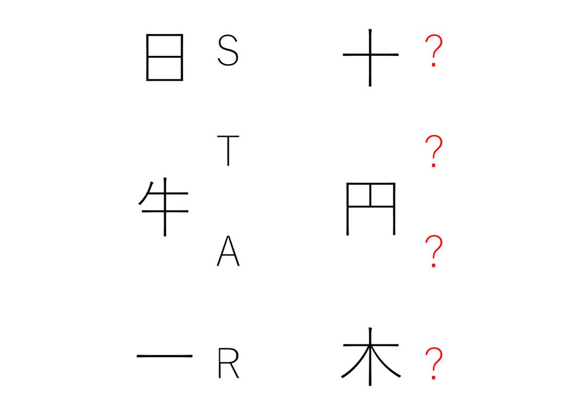 例のように、それぞれ直線を二本足して存在する言葉にしてください。