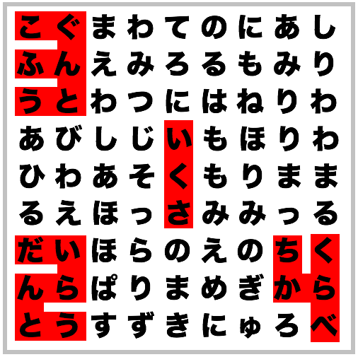 消えている文字を矢印の方向に読むと「いくさ」となります