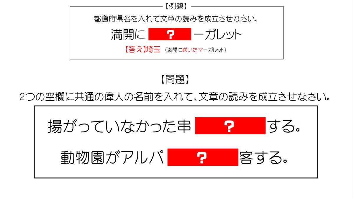 例題を元に2つの文章に共通して入る偉人の名前をお答えください。